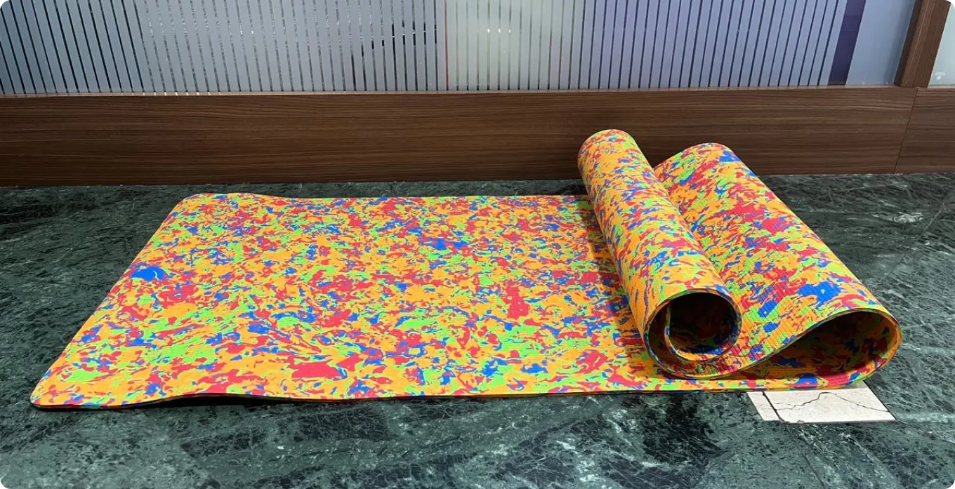 The yoga mat is made with recycled material, fit for indoor and outdoor exercise.